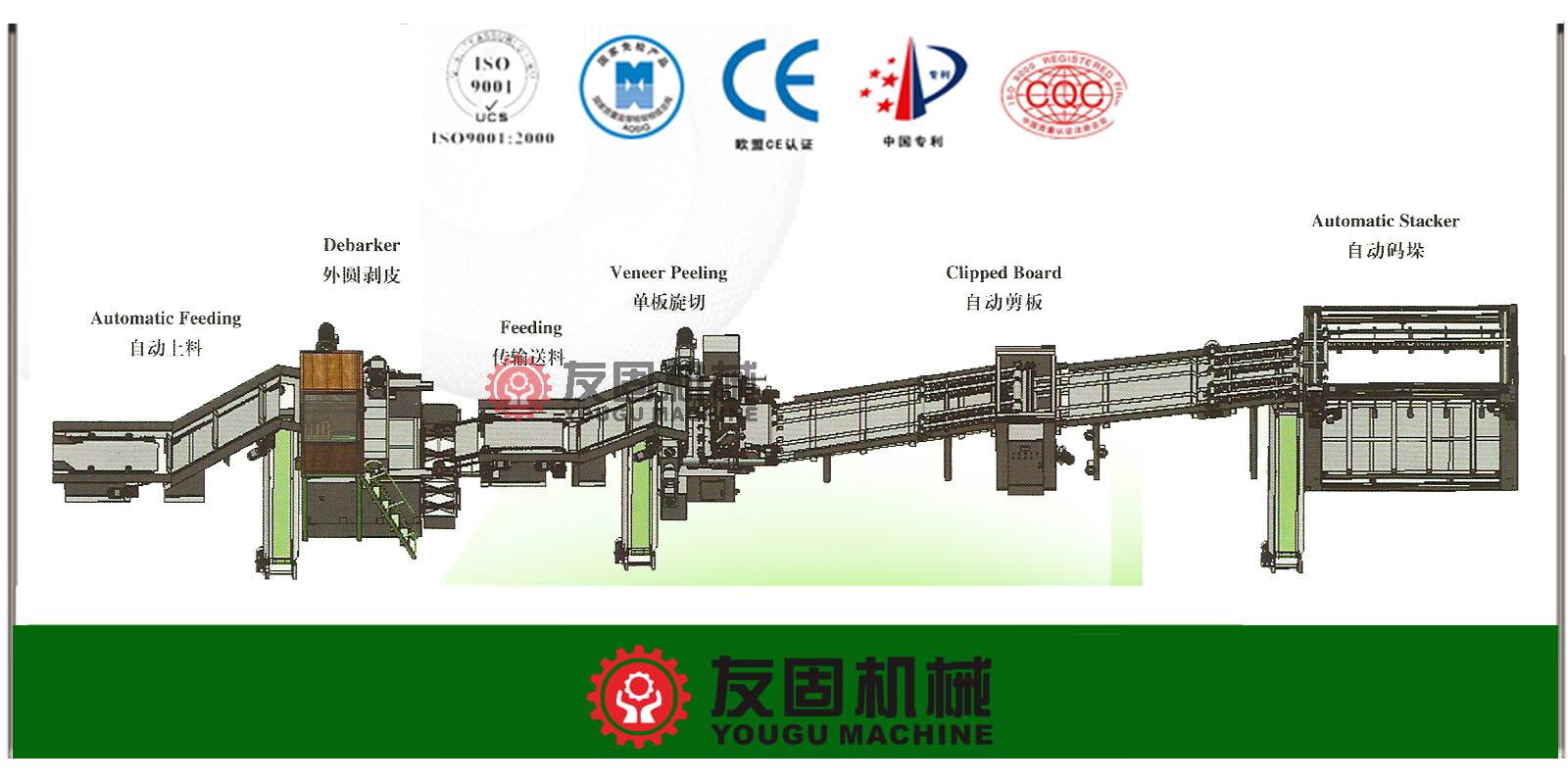 automatic log feeding,debarker,log feeding conveyor,veneer peeing machine,veneer clipper cutting machine,automatic stacker